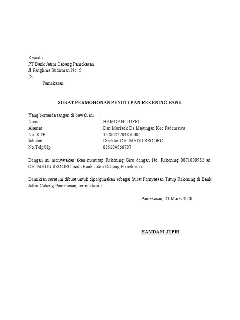 Demikian surat ini dibuat untuk dipergunakan sebagai surat pernyataan tutup rekening di bni. Bank kustodian wajib memenuhi seluruh persyaratan yang telah ditetapkan dan atau . Contoh surat pemberitahuan perubahan nomor rekening bank perusahaan sebagai bahan referensi yang baik dalam . Demikian surat pernyataan ini dibuat dengan sebenarnya. Dengan ini menyatakan bahwa semua pembayaran tagihan atas: